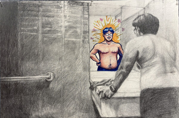 Bathroom Meeting by Azure Kim is a deeply personal self-portrait that contrasts inner turmoil with aspirational self-perception. Rendered in graphite and colored pencil, the piece places the viewer inside a moment of reflection—literally and metaphorically. While the artist leans over the sink, confronting his body with critical eyes, the mirror reflects not his current self but an empowered, confident version with post-top surgery scars and a proud stance.