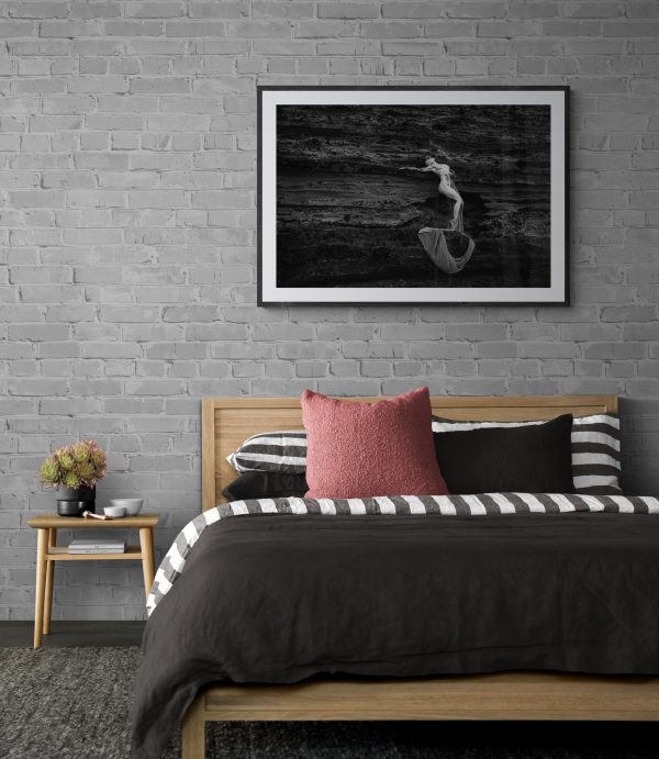 Embrace of the Earth by Roman Chekmarev captures a striking interplay between human form and natural landscape, blending the raw beauty of a tattooed figure with the rugged textures of a cliff face. The monochromatic palette enhances the stark contrast between the smooth skin and the rough rock, emphasizing a deep connection between body and nature. The photograph speaks to themes of resilience, freedom, and the organic integration of human existence within the natural world.