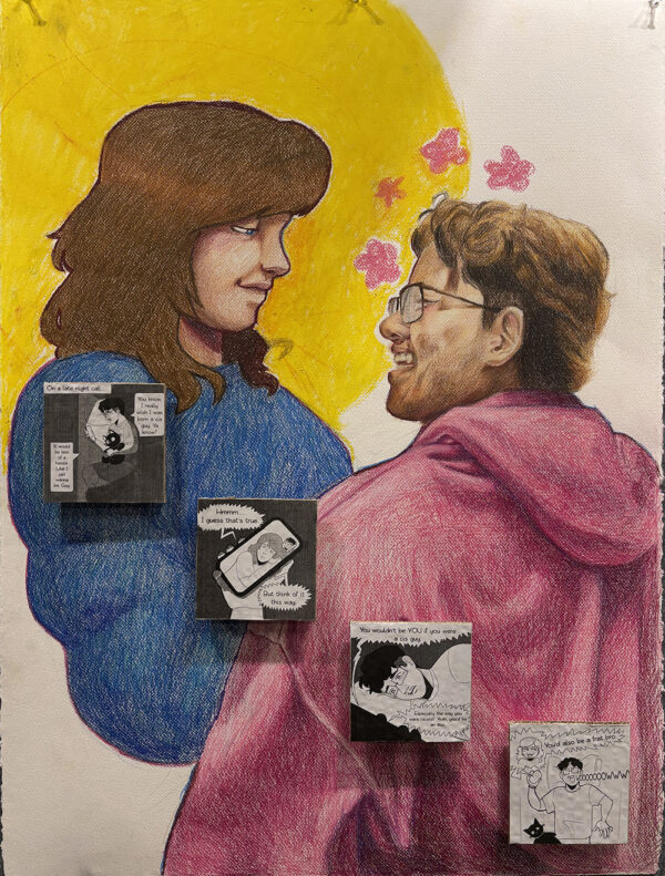In Flag Manifested, Azure Kim explores a deeply personal reflection on trans identity, visibility, and love. The piece blends traditional colored pencil portraiture with comic-style panels to portray a moment of affirmation and emotional intimacy between the artist and his fiancé — also a trans man. While the main image captures a warm, shared gaze under a symbolic yellow halo, the surrounding black-and-white comic fragments give voice to internal dialogues shaped by dysphoria, societal perception, and the long journey of transitioning.