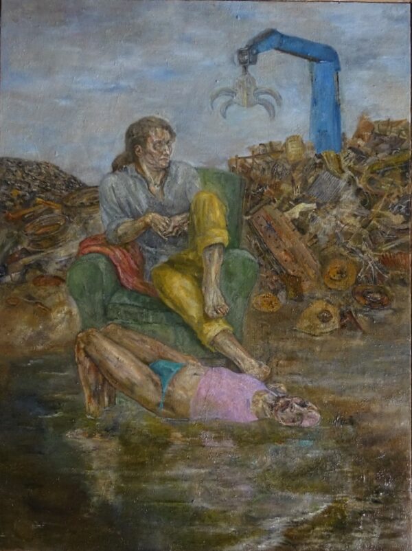 In France, Cal Fraser places his figures within a surreal junkyard landscape, juxtaposing detachment and decay with uneasy sensuality. A seated figure lounges on an armchair amid industrial debris, while another body—partially submerged and dressed in pastel undergarments—lies lifeless before them. The scene evokes themes of consumption, alienation, and erotic apathy. Fraser’s trademark painterly style and symbolic staging challenge viewers to consider how national identity, desire, and history collide in grotesque and intimate ways.