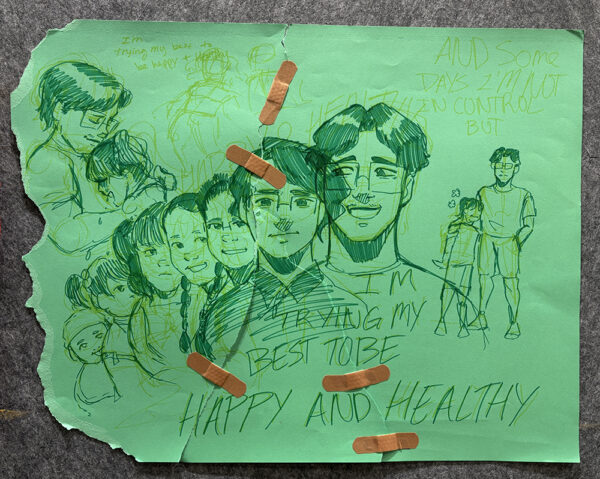 In this drawing, the artist imagines offering comfort to that younger version of himself: lending a shoulder to cry on, listening, and nurturing the dreams that were once dismissed. The work becomes an act of healing and self-empathy, a visual reminder of the ongoing journey toward becoming truly “happy and healthy.”