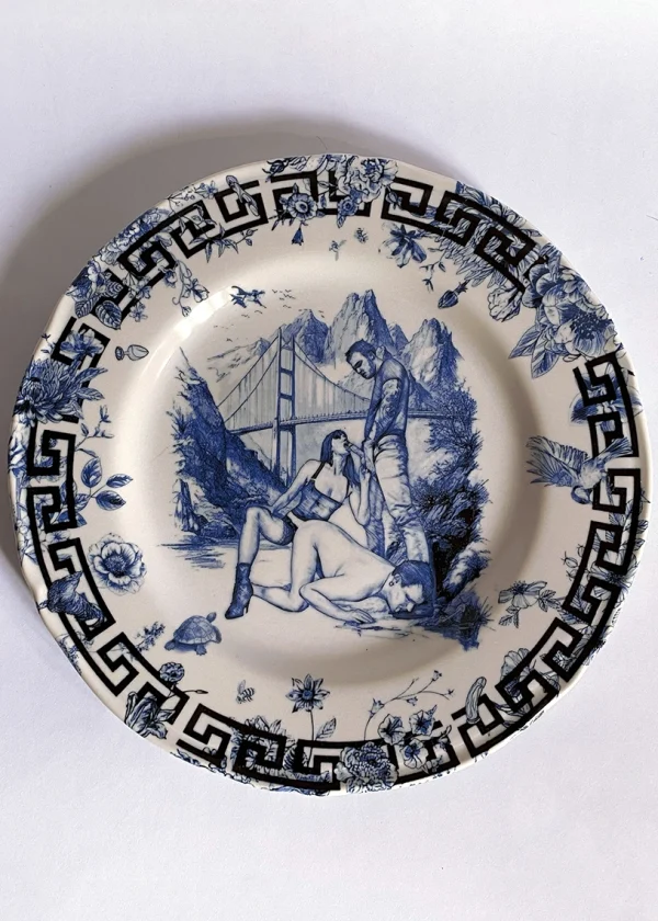 This striking ceramic plate by VANADIO23, part of the P0RN0 ROMANTIKO collection, fuses classical blue-and-white porcelain aesthetics with provocative contemporary imagery, creating a bold visual tension that challenges tradition, desire, and modern cultural narratives.