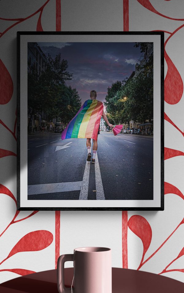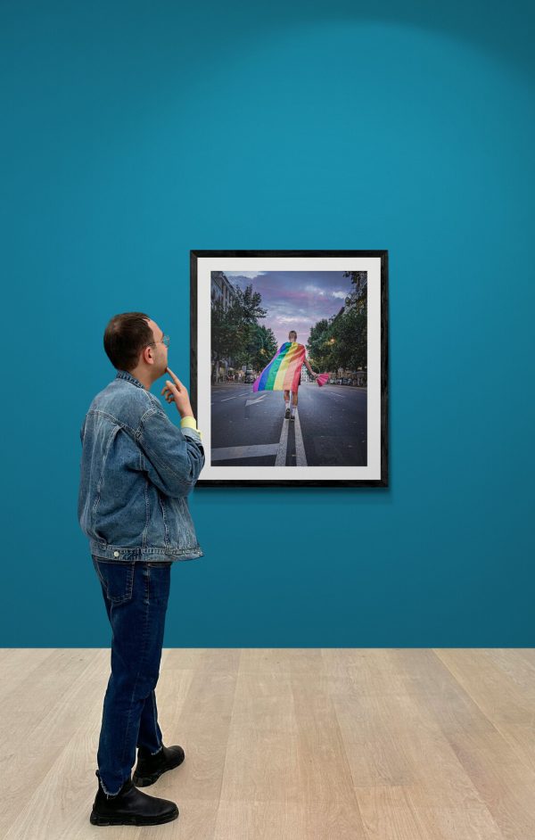 Pride Stride by Anton Parfenov captures a powerful moment of pride and freedom on the streets of Madrid. The image showcases a lone figure draped in the iconic rainbow flag, confidently walking into the heart of the city as dusk falls, symbolizing both resilience and celebration. With a fan in hand and a crown atop their head, this photograph evokes the spirit of LGBTQ+ pride—bold, fearless, and unapologetic. The sky, bathed in shades of purple and pink, adds a surreal touch to the scene, making it a visual testament to self-expression and the continuous journey towards equality.
