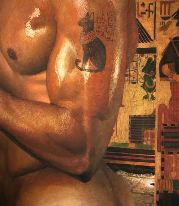Rendered in rich, warm tones, the muscular body becomes both an object of devotion and a vessel of spiritual power. Torchlight glides across the skin, revealing a tattoo of Bastet that blurs the boundary between myth and identity. Behind him, fragments of temple iconography evoke an atmosphere of ceremony and mysticism.