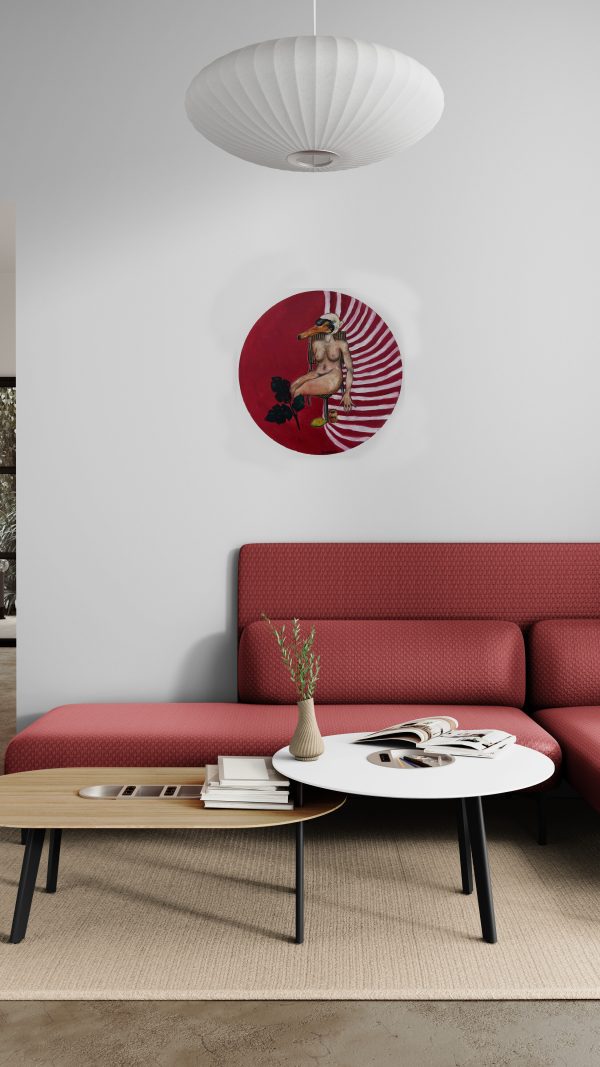 “Reclining Swan” by Julia Temzan is a captivating piece that merges surrealism with a bold exploration of identity and transformation. The painting portrays a nude figure with the head of a swan, comfortably seated on a chair against a dynamic red background with hypnotic white stripes. The stark contrast between the figure’s naturalistic human body and the avian head challenges the viewer to consider themes of duality, transformation, and the fluid nature of identity.