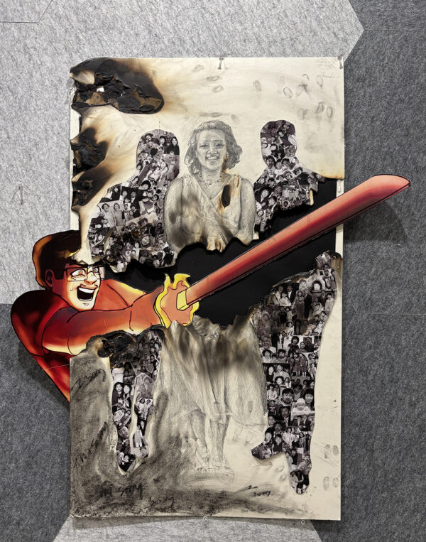 This powerful mixed-media work explores the emotional conflict of familial love and the pain of misrecognition. Coming from a deeply religious immigrant family, Azure Kim expresses the tension between being loved and being unseen. The central figure, framed by family memories and scorched textures, represents the struggle of being called “daughter” while living a truth that contradicts those labels. With a bold animated self-portrait swinging a flaming sword, the piece captures both the rage and resilience required to carve out a space for one’s authentic self.