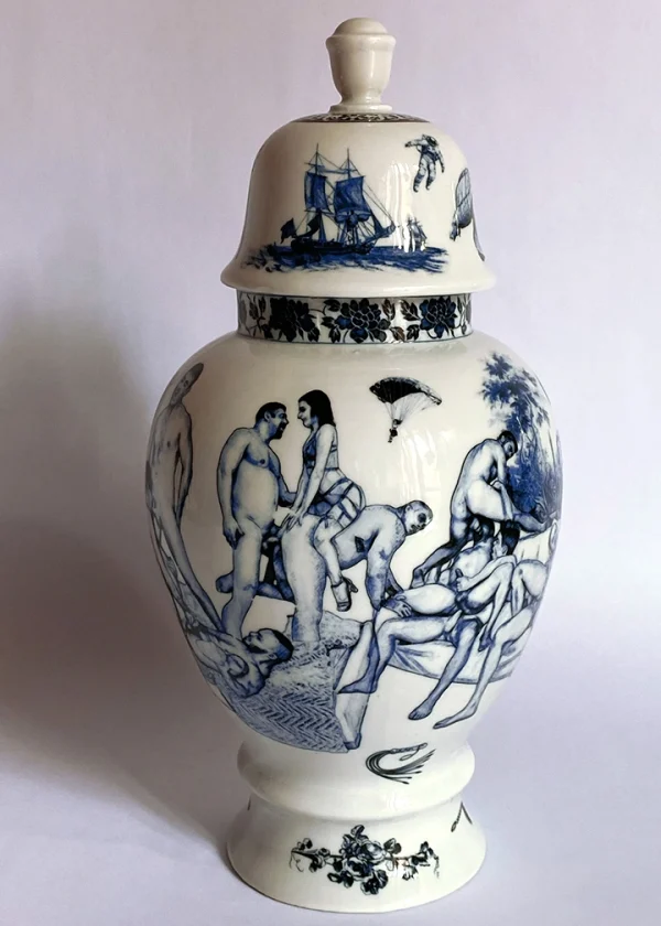 This captivating ceramic piece by VANADIO23, part of the “P0RN0 ROMANTIKO” collection, juxtaposes classical porcelain iconography with bold contemporary imagery, inviting viewers to reflect on desire, vulnerability, and the tension between tradition and modern visual culture.